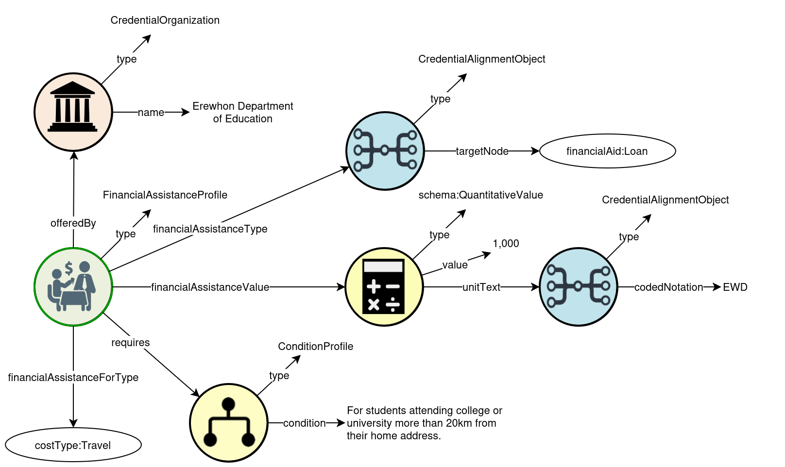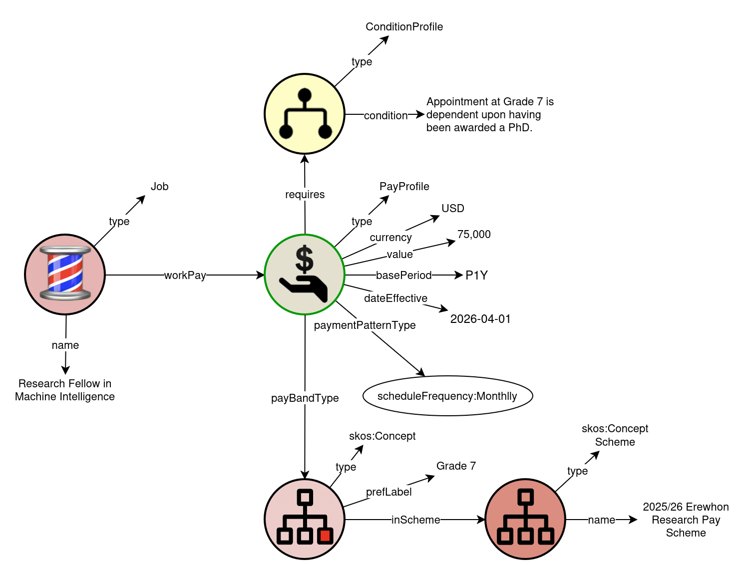This set of terse statements in the 3-part grammatical form of triples is expressed in the abstract syntax of the directed graph below. Where relevant, the icons for the JSON-LD and Turtle concrete syntaxes appear below the figure.