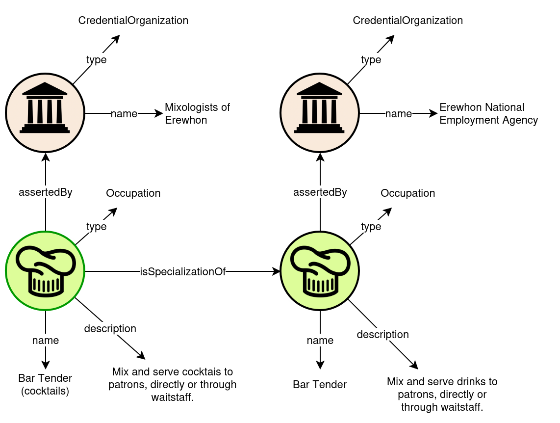 Even beyond what is explicitly included in vocabulary, CTDL allows the use of terms from other RDF specifications when describing resources. In some cases CTDL has been designed in the expectation that this will happen. So rather than having terms in CTDL for everything, the recommendation is that terms from some other specification should be used. For example, in the Education to Work context, Occupations and Jobs may be classified according to category; if they are, it is recommended that the W3C Simple Knowledge Organization System (SKOS) vocabulary is used to describe these categories. An introduction to SKOS is provided by the SKOS Primer.